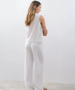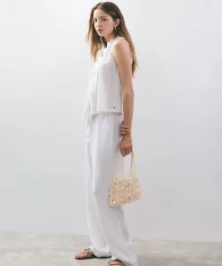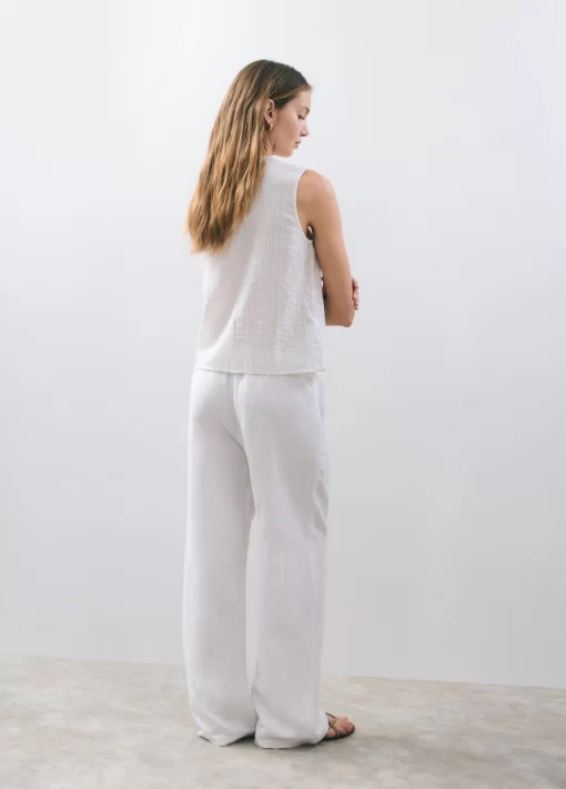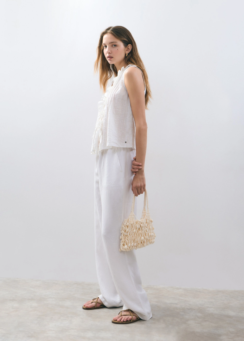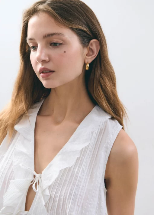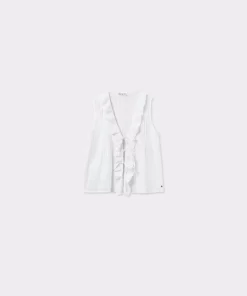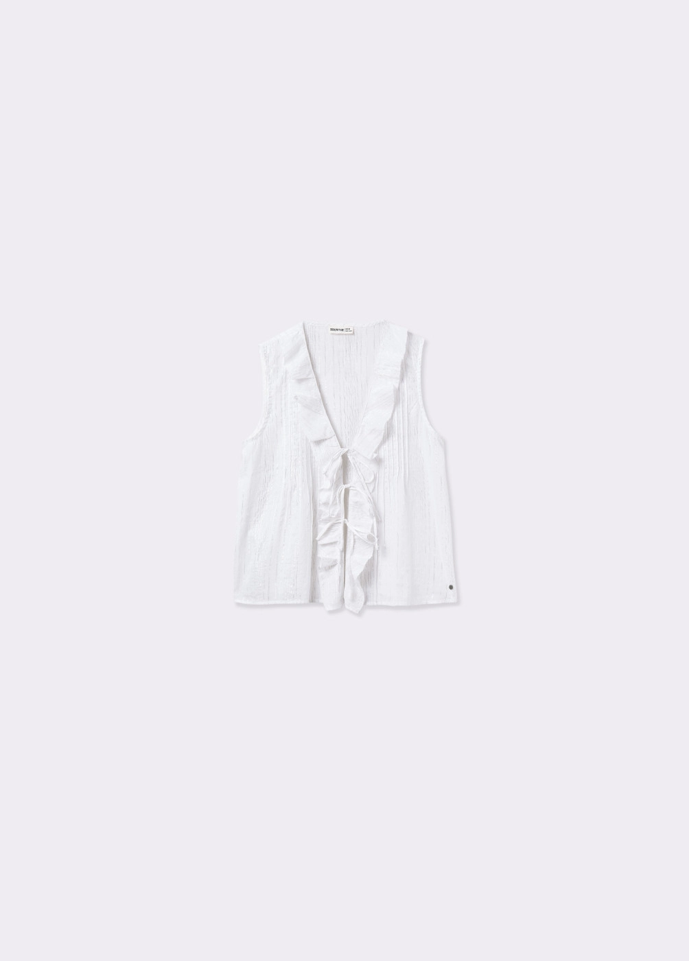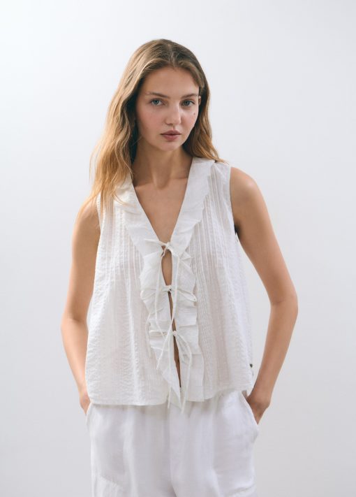 Blusa sin mangas, cuello de pico, volantes en la parte frontal y detalle de lazos.