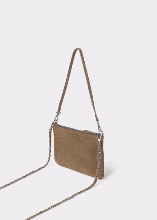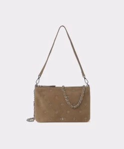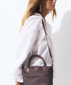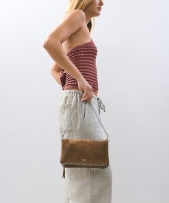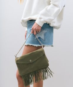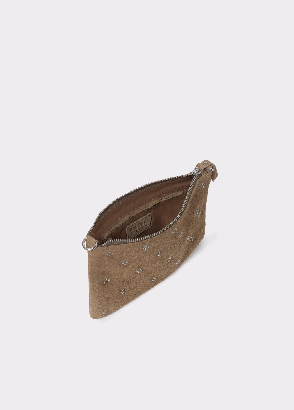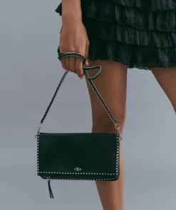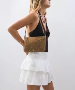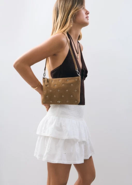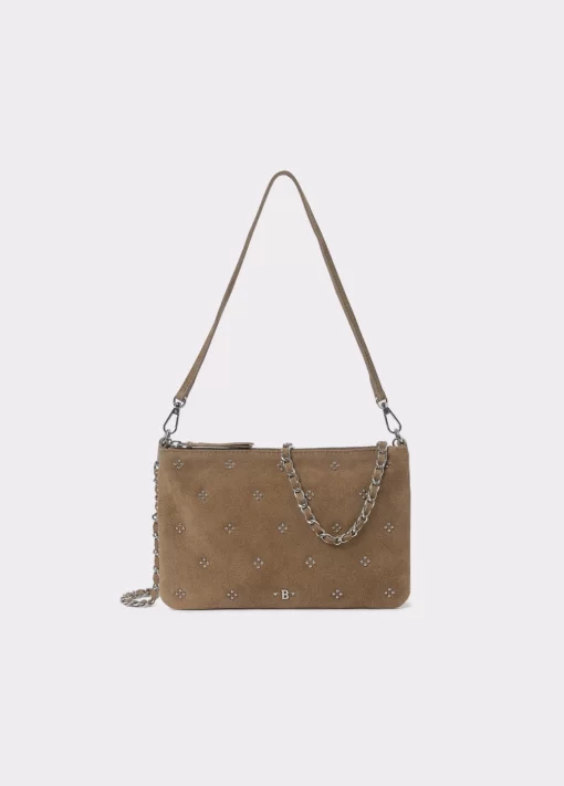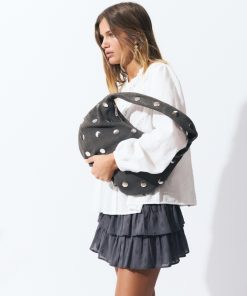 Bolso de piel estilo bandolera con tachitas. Dispone de doble correa.