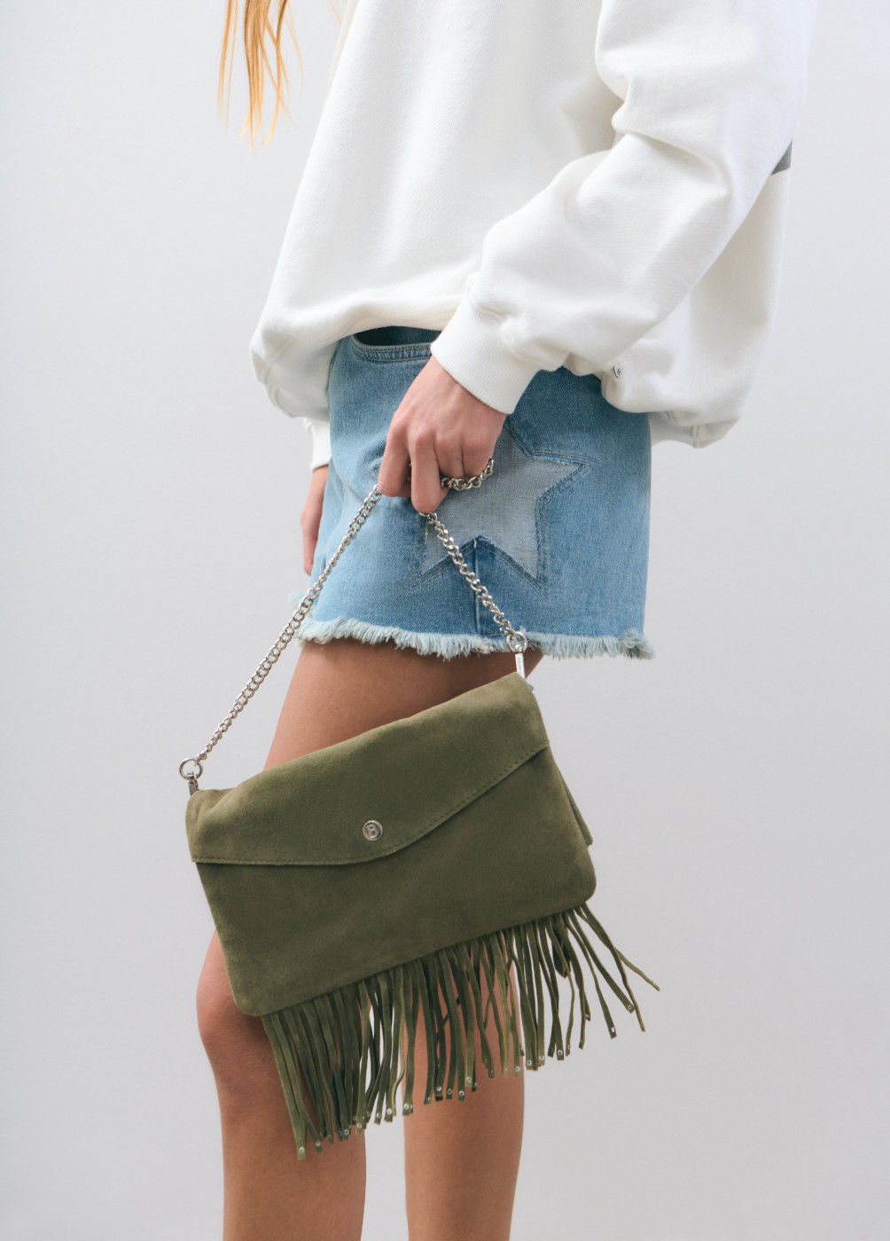 Bolso de hombro de piel en color kaki con solapa, tachas de estrellas y flecos. Dispone de doble correa.