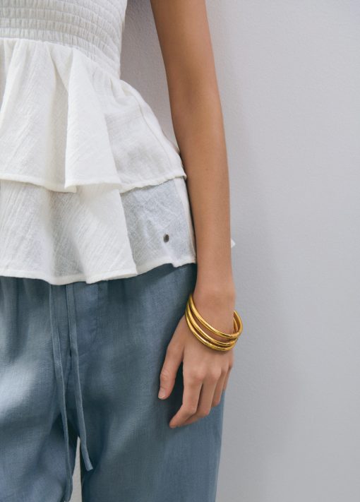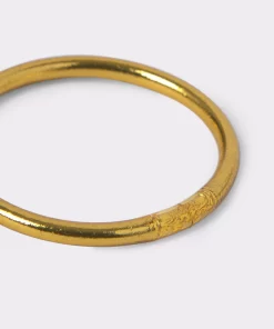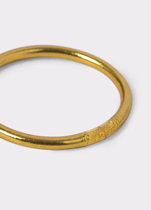 Pulsera dorada Pan de Oro con grabado LUCKY and RICH hechas a mano. Las pulseras Pan de Oro difunden amor, suerte, protección, unidad y buena fortuna para quien las lleva.