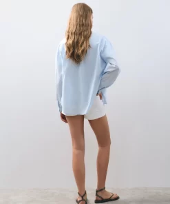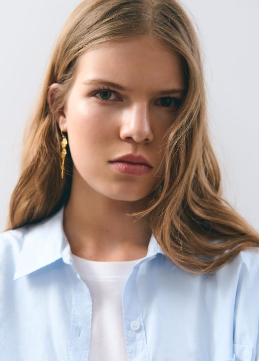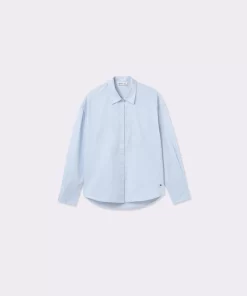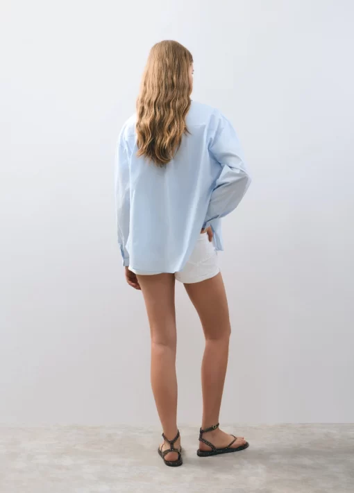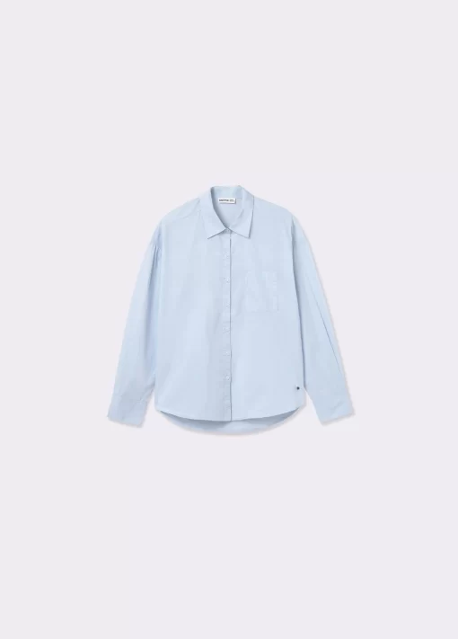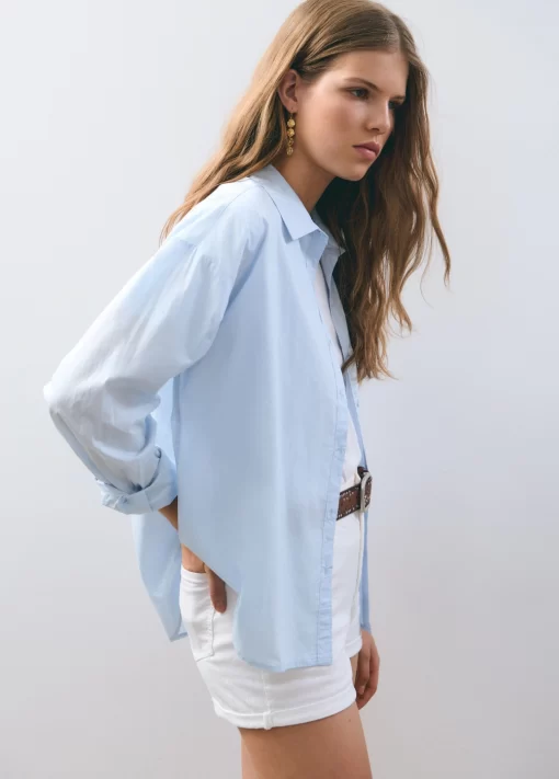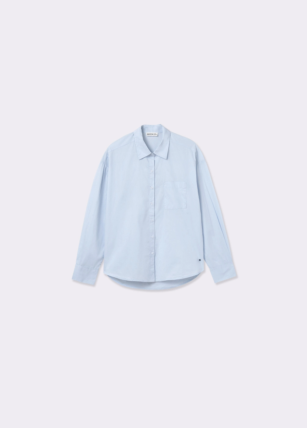 Camisa básica de algodón de manga larga, cuello con solapas, bolsillo frontaly cierre mediante botones en el frontal.