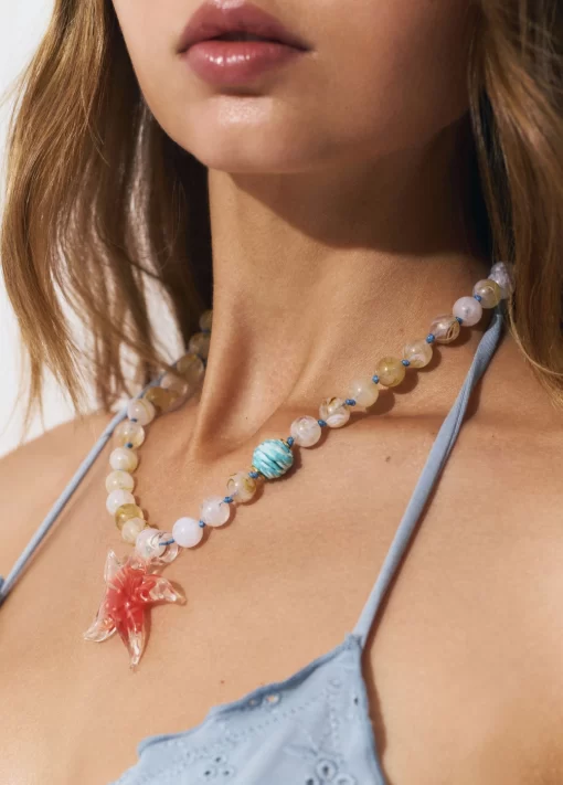 Collar de bolas en color naranja con colgante de estrella de mar.