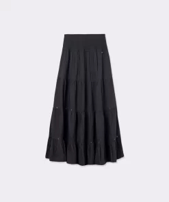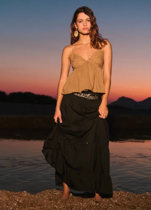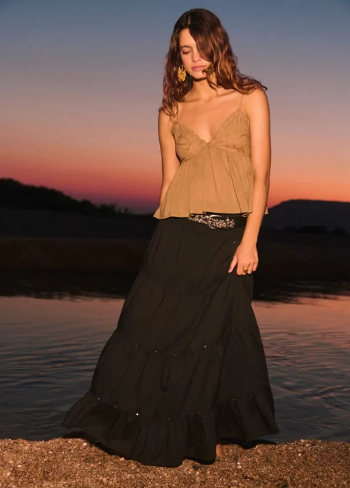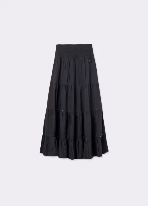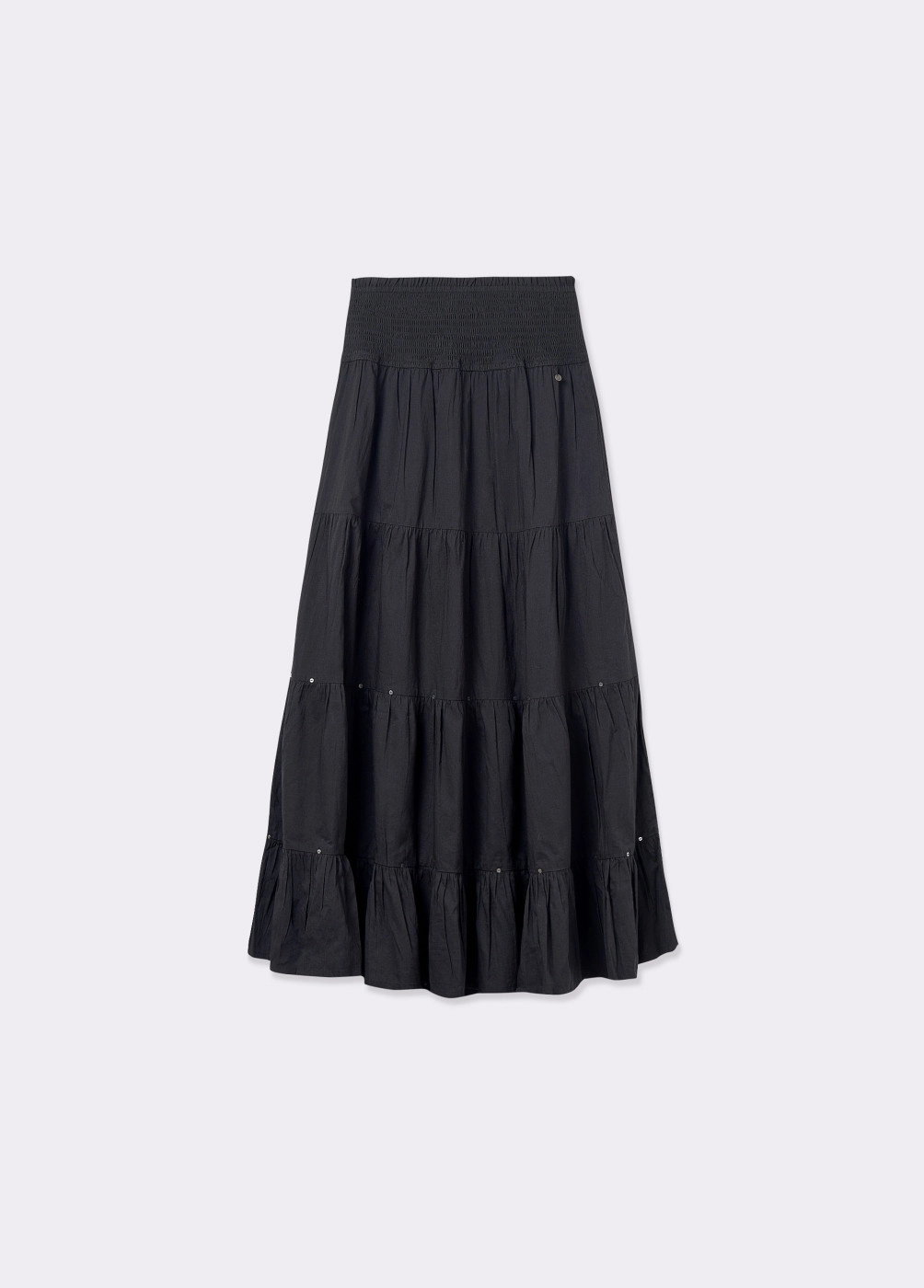 Falda larga con smock en la parte superior, volantes y detalle de lentejuelas.