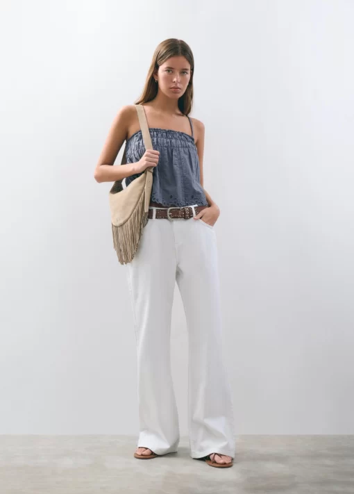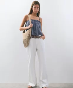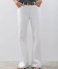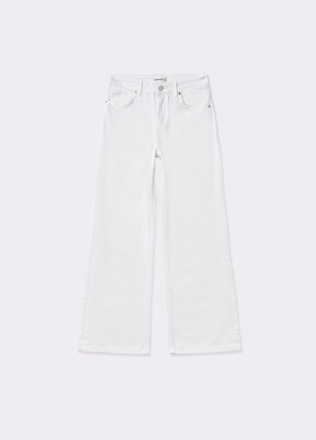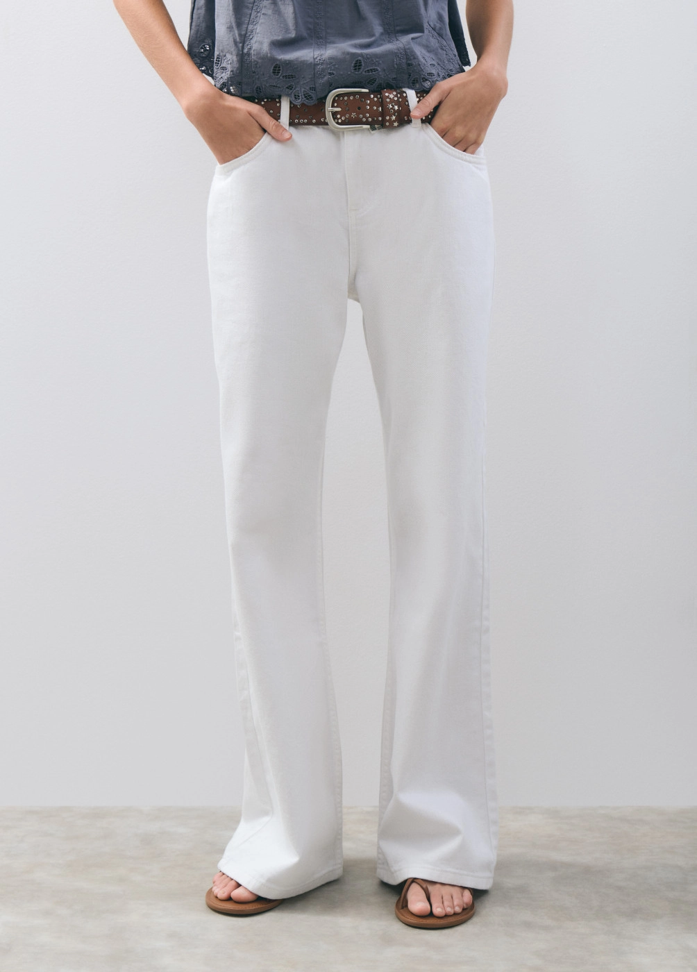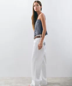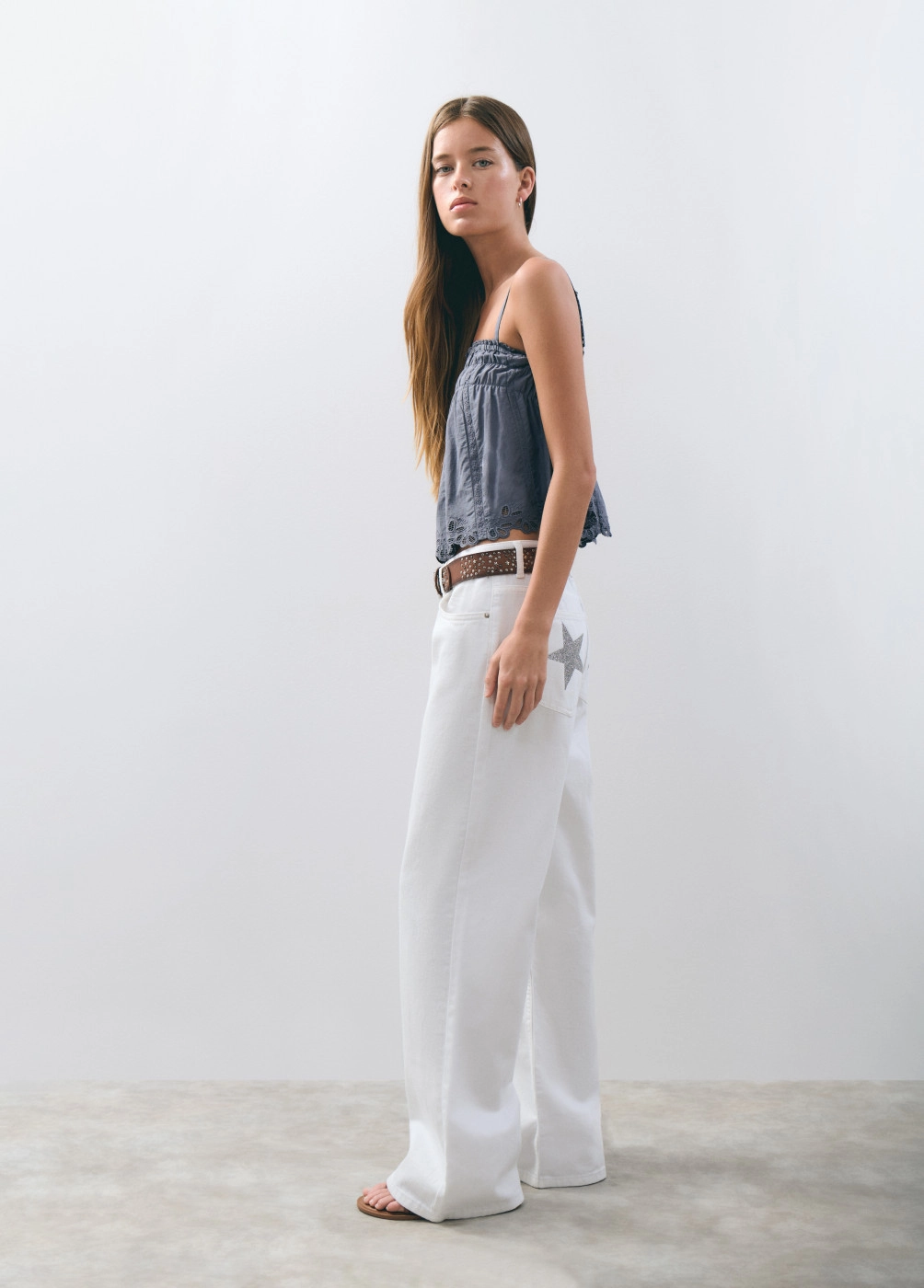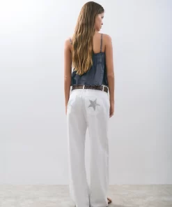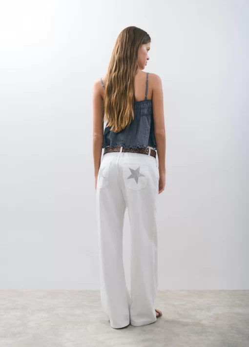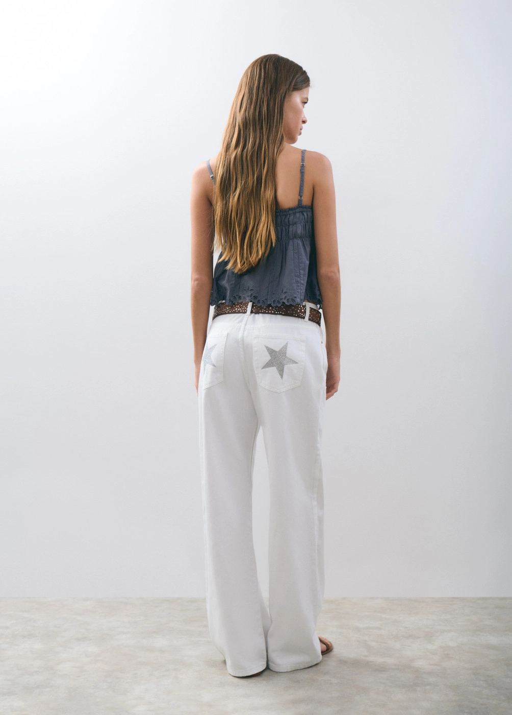 Pantalón recto con estrellas en los bolsillos traseros. Cierre mediante cremallera y botón.