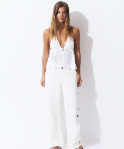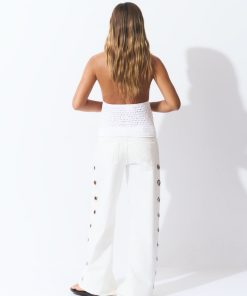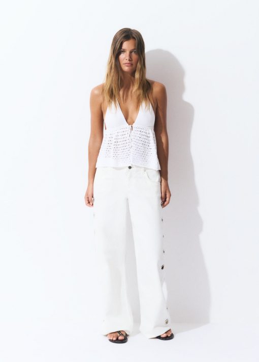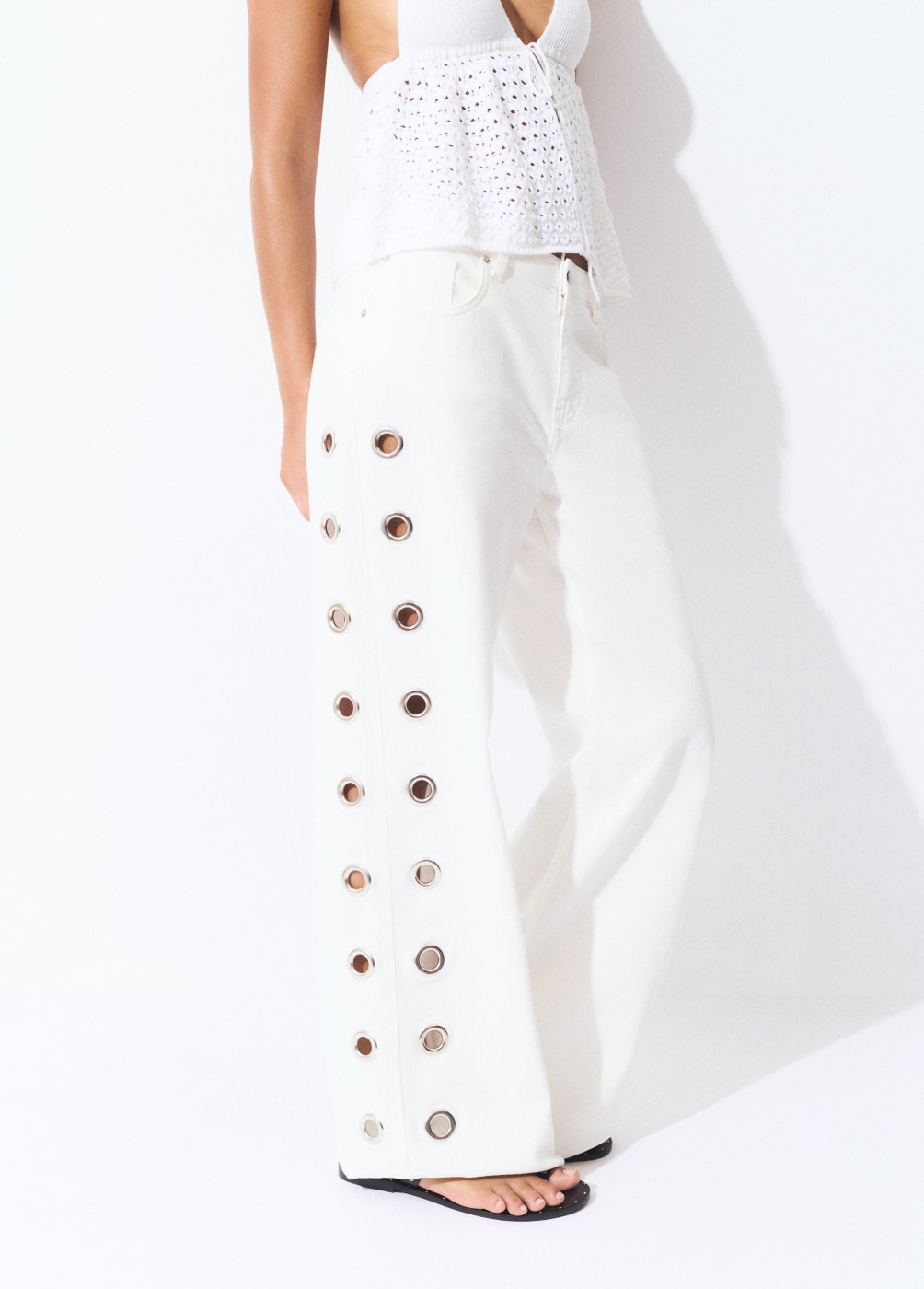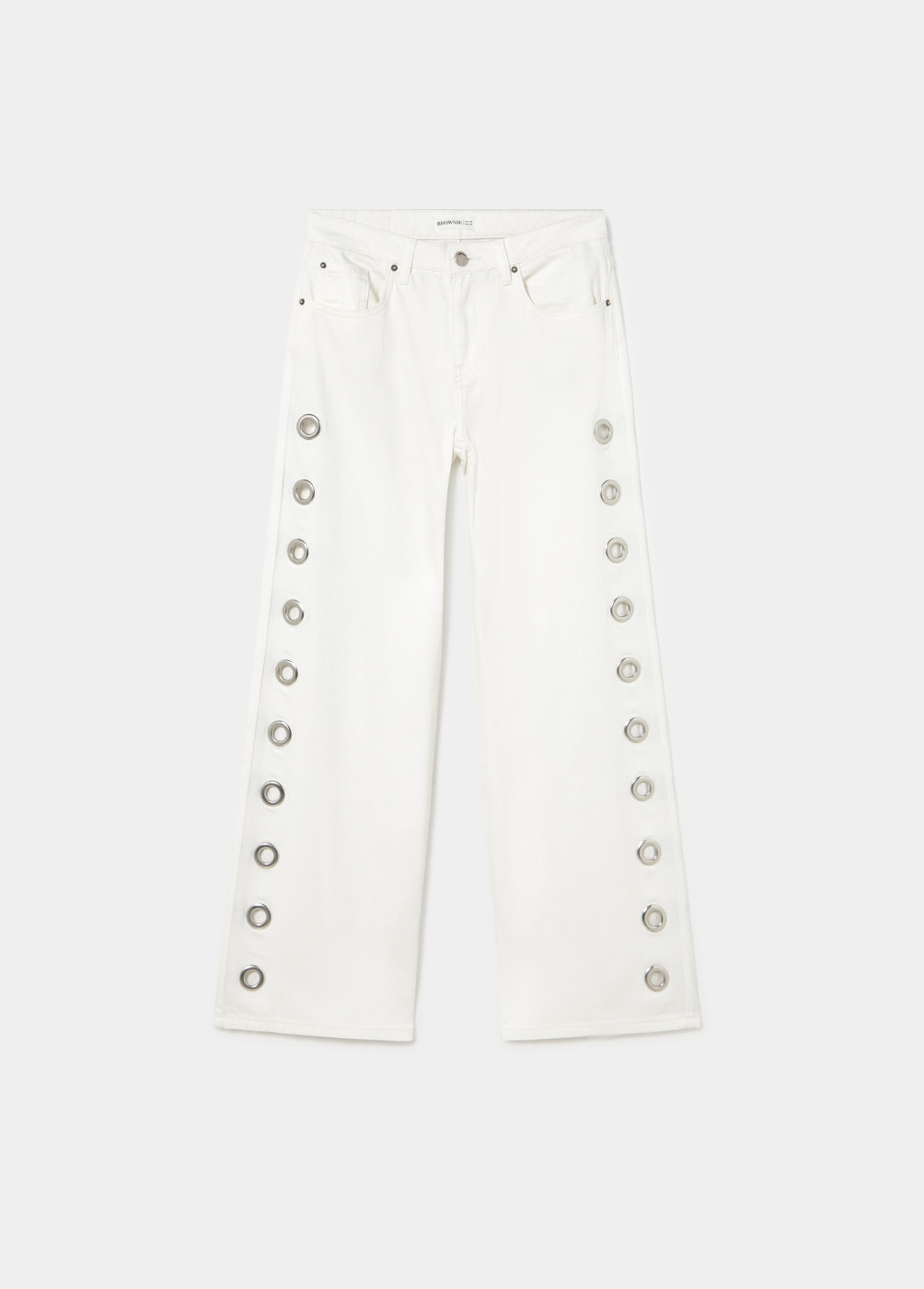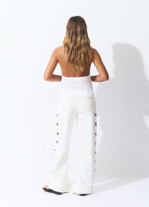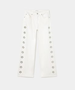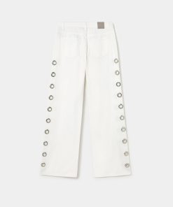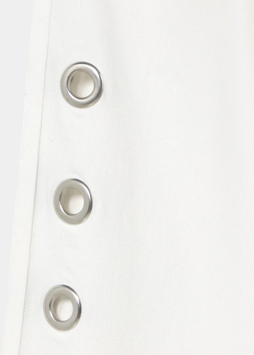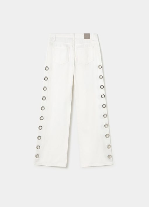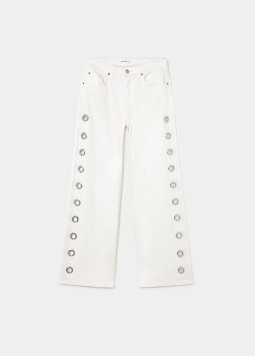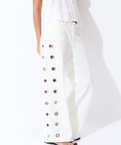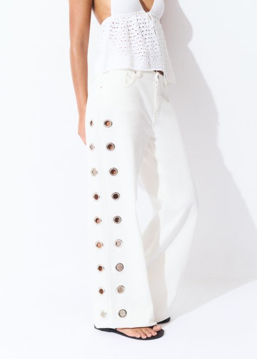Pantalón recto con detalle de eyelets en la parte lateral.Cierre mediante cremallera y botón.