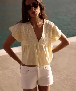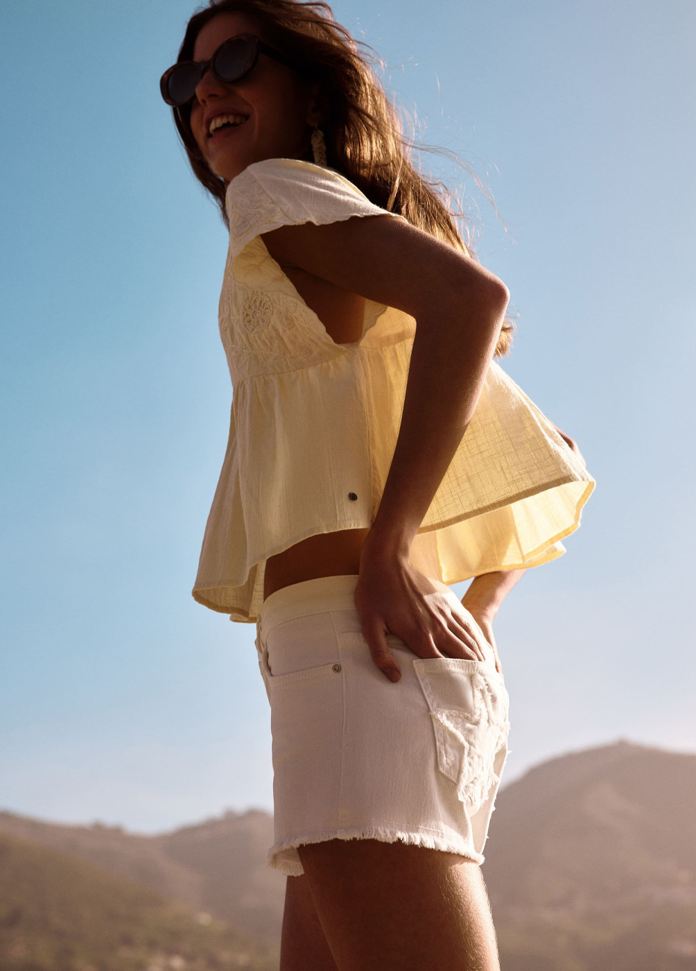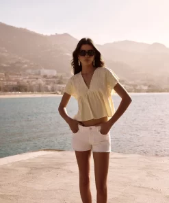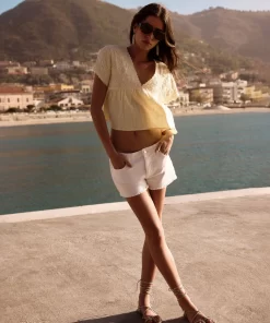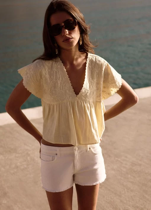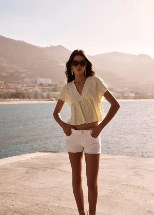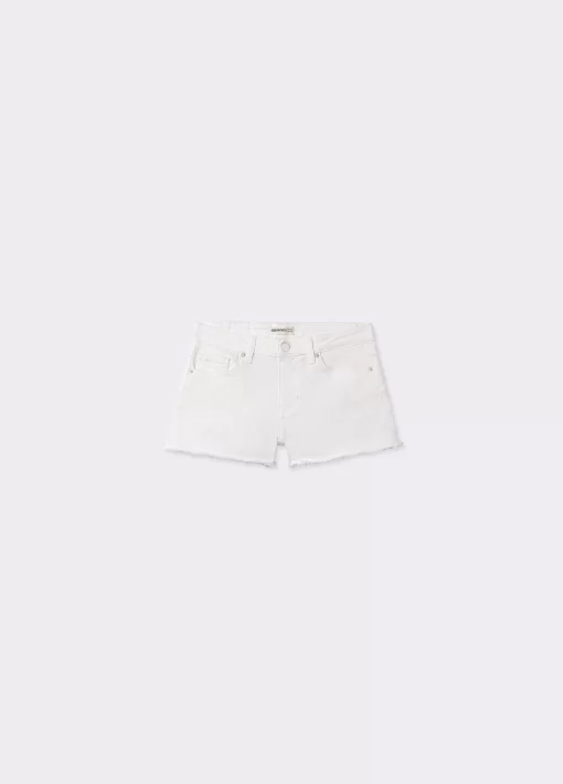 Short de tiro medio con detalle de estrellas en los bolsillos frontales y bajo desflecado. Cierre mediante cremallera y botón.
