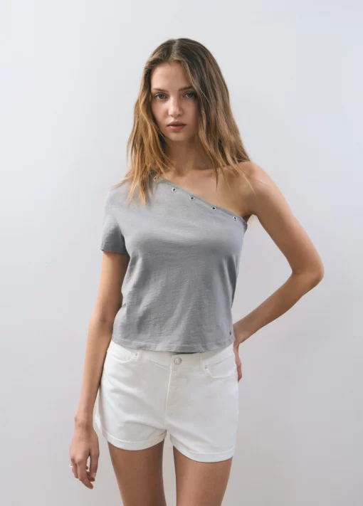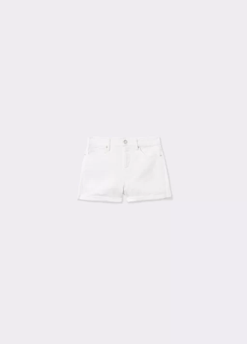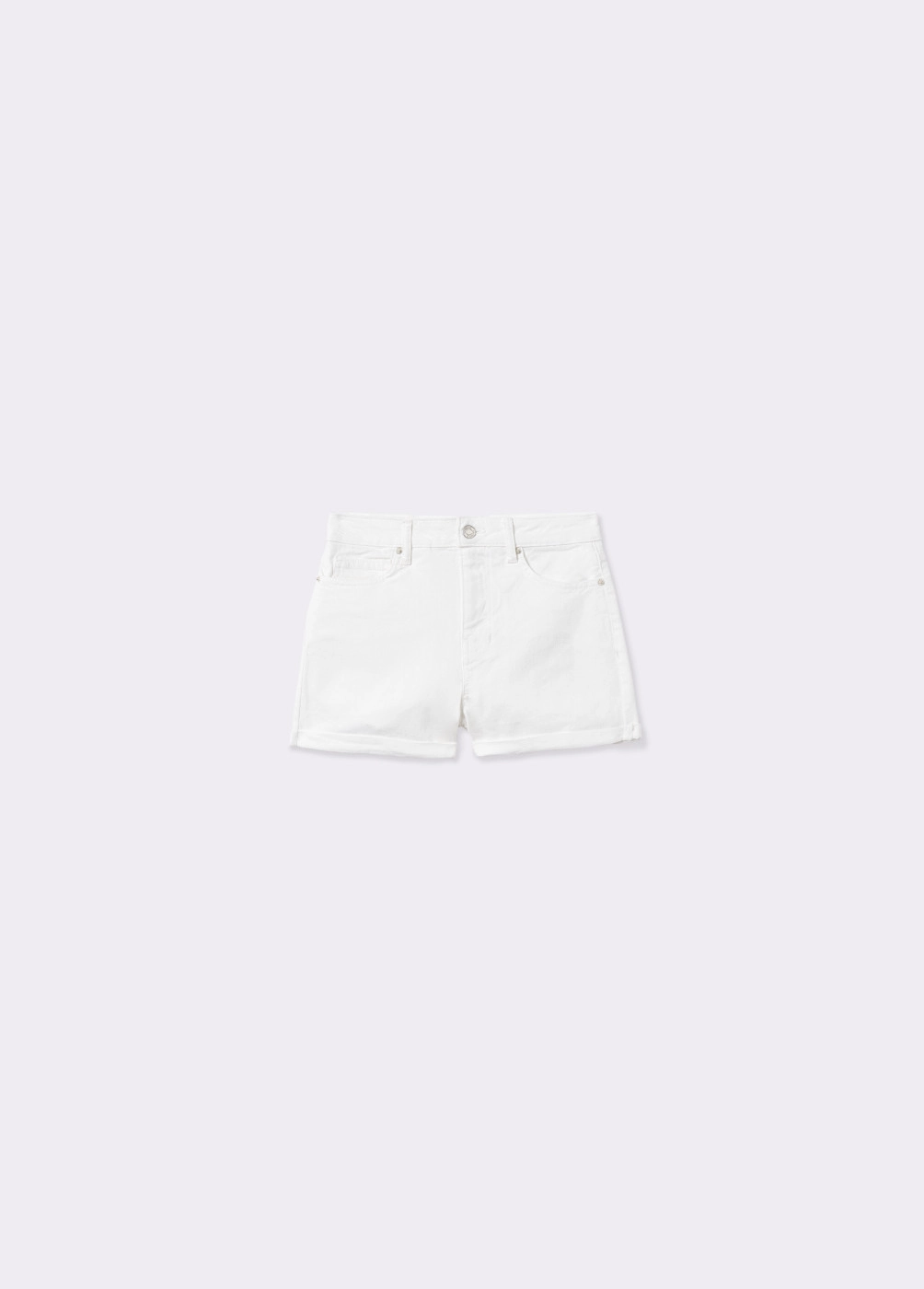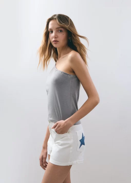 Short con estrellas de parche denim en los bolsillos traseros. Cierre mediante cremallera y botón.