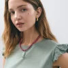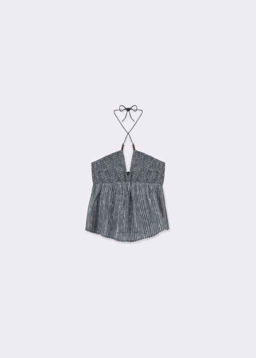 Top de rayas con smock, cuello halter mediante lazada y detalles con lurex.