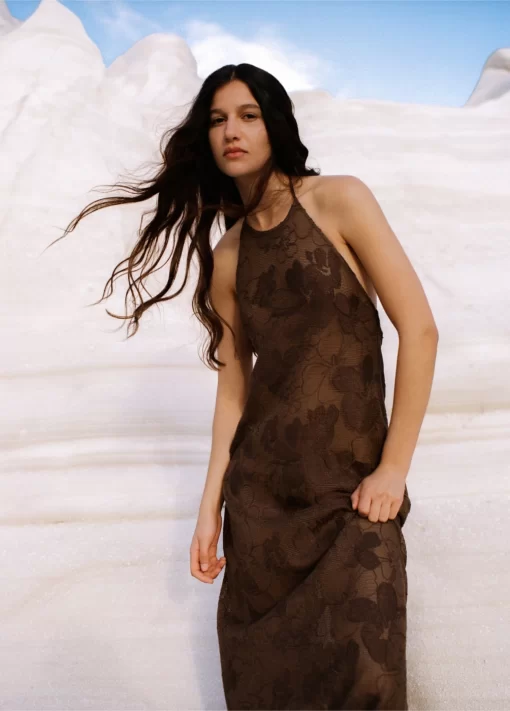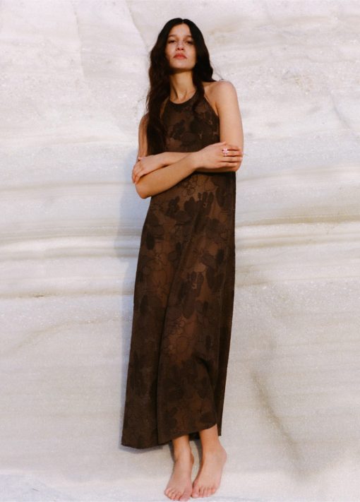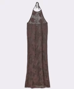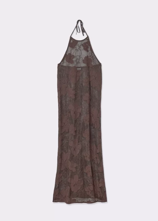 Vestido largo bordado semitransparente con cuello halter mediante lazada.